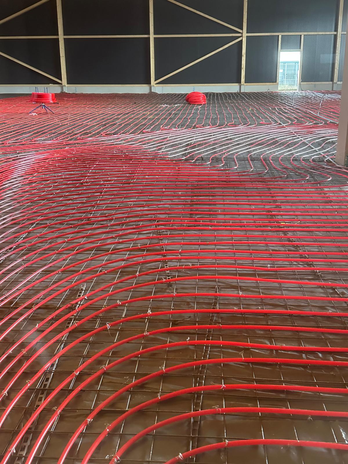 In der Region Altötting haben wir ein anspruchsvolles Projekt im Bereich Heizungsbau realisiert, bei dem eine großflächige Industrie-Fußbodenheizung in einer modernen Gewerbehalle installiert wurde. Die präzise Verlegung der roten Systemrohre auf einer stabilen Trägerkonstruktion gewährleistet eine gleichmäßige Wärmeverteilung über die gesamte Hallenfläche hinweg. Durch diese effiziente Flächenheizung wird eine konstante Raumtemperatur ermöglicht, die besonders in hohen Hallenbauten für ein angenehmes Arbeitsklima sorgt und gleichzeitig die Energiekosten nachhaltig senkt.